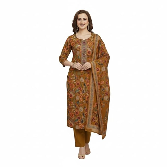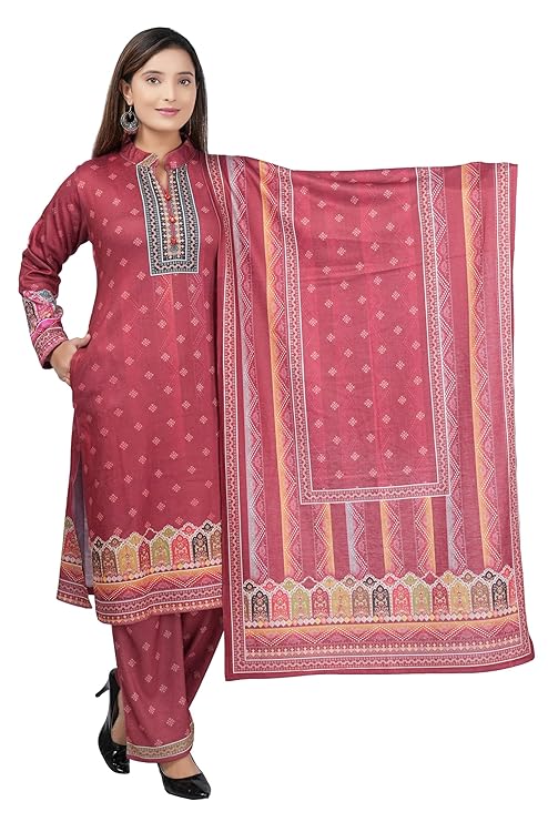 Women's Embroidered Printed Kurta Sets Karachi Wool Kurta Palazzo and Stole - Warm Winter Wear, Full Sleeve, Mandarin Collar (Set of 3 Piece) DYNAA